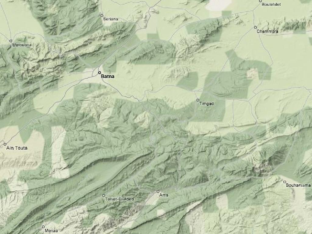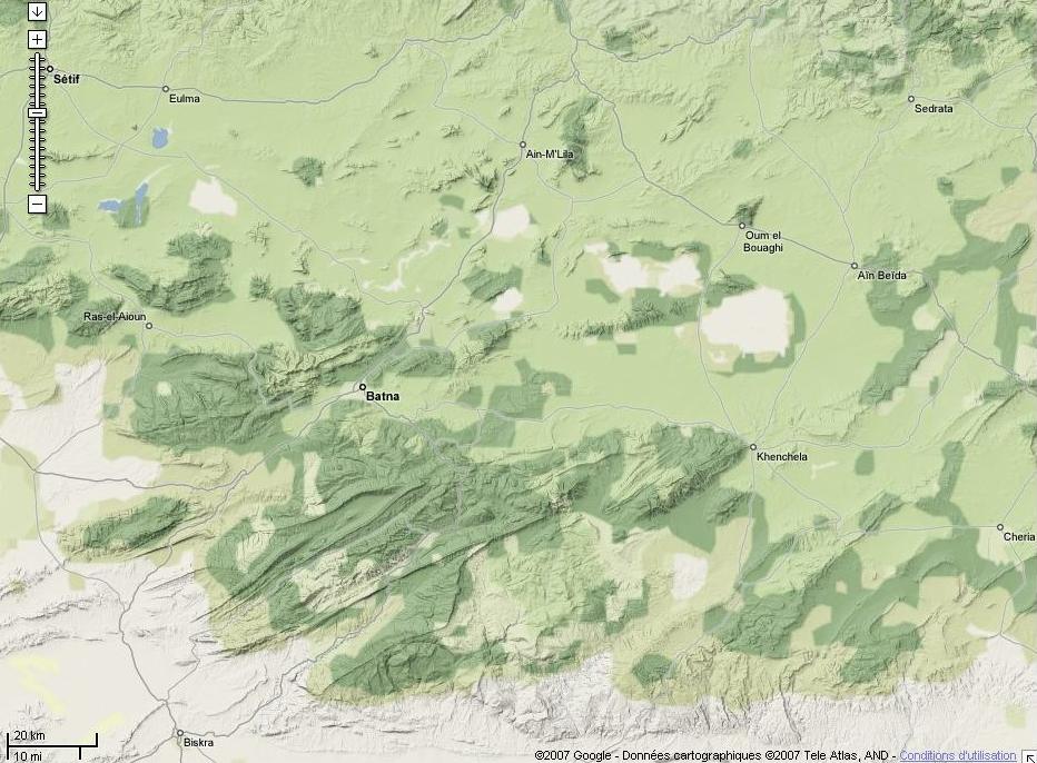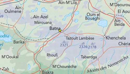 Batna is situated at a high altitude in the middle of the Aurès mountain range We see also on this map the Rhoufi balcony in a mountain pass further South and where we will make a touristic trip..