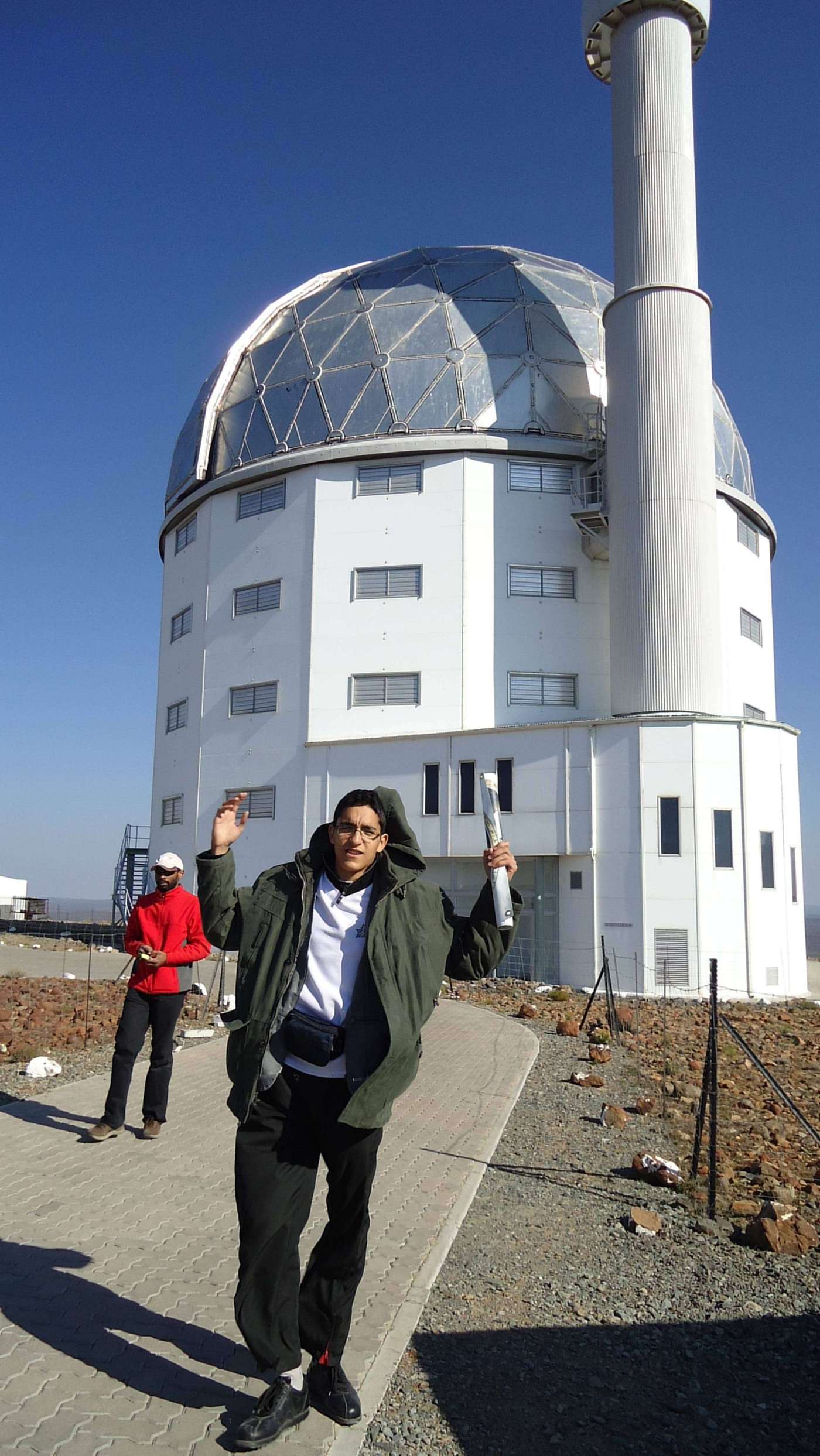 In front of The South African Large Telescope. It is the largest single optical– infrared telescope in the Southern Hemisphere, with a hexagonal mirror array 11 metres across.