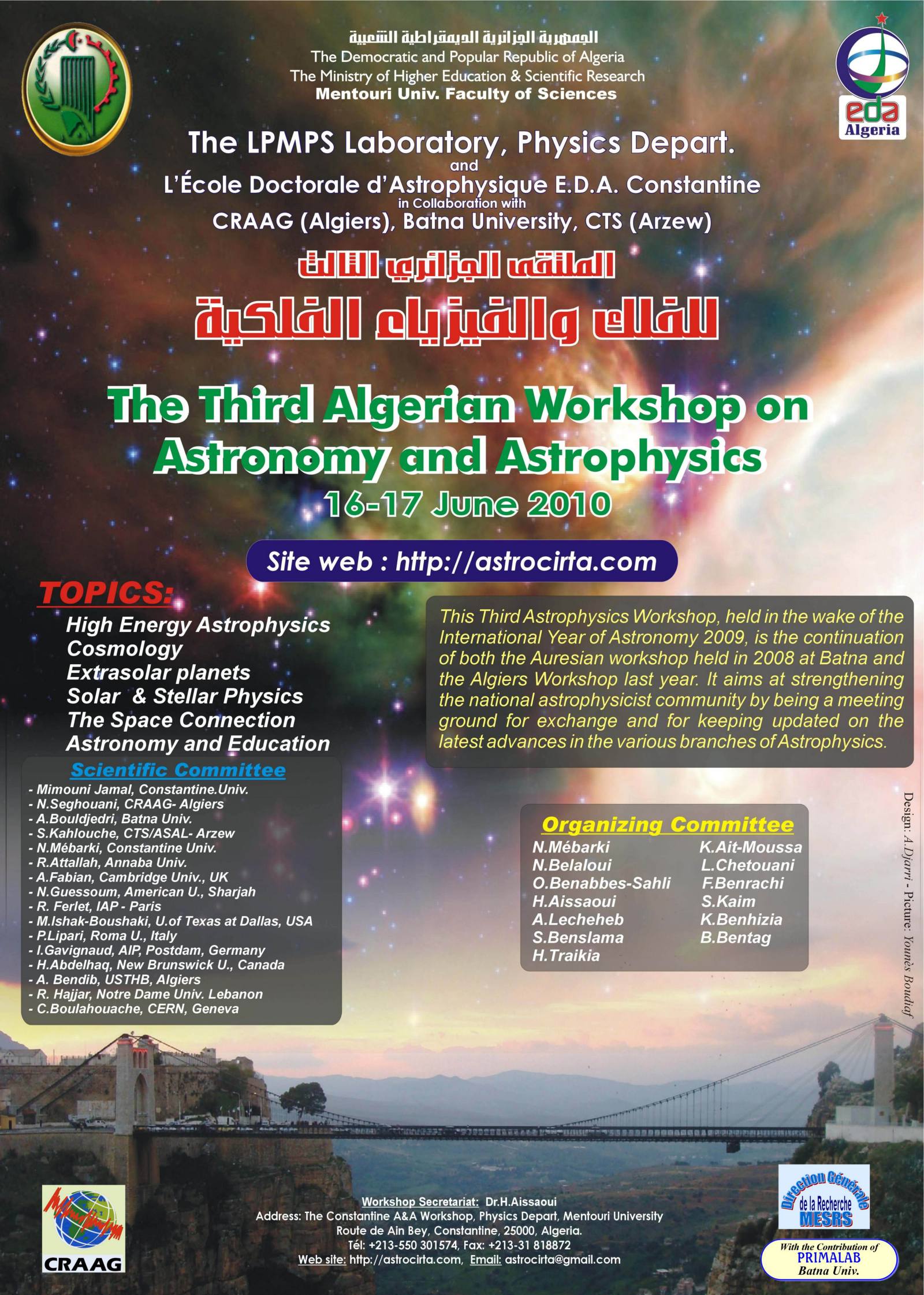 This Third Astrophysics Workshop held in the wake of the International Year of Astronomy 2009, is the continuation of both the Auresian workshop held in 2008 at Batna and the Algiers Workshop last year. It aims at strengthening the national astrophysicist community by being a meeting ground for exchange and for keeping updated on the latest advances in the various branches of astrophysics.
