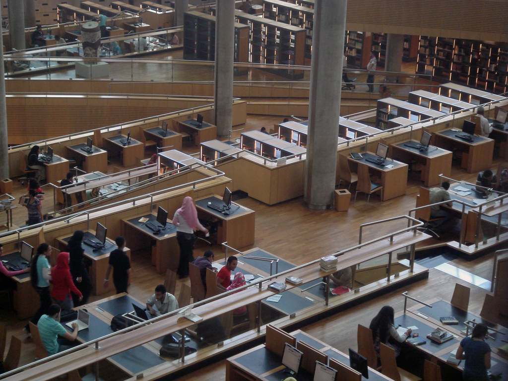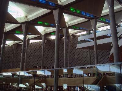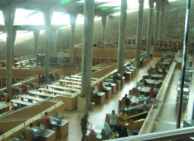 مكتبة الاسكندرية تحفة معمارية وثقافية: منظر عام لجزء من قاعة المطالعة ومبنى خارجي منقوش عليه عبارات من كل لغات العالم