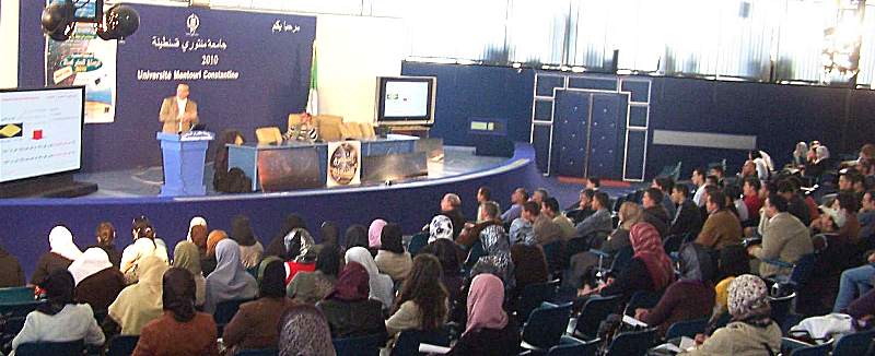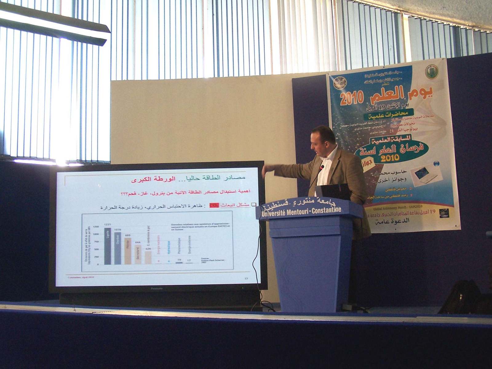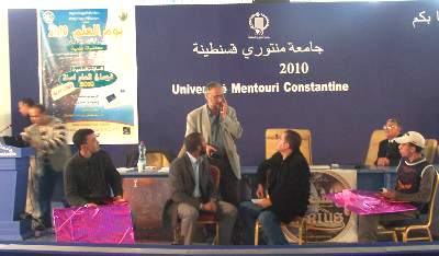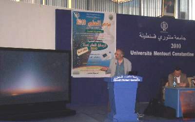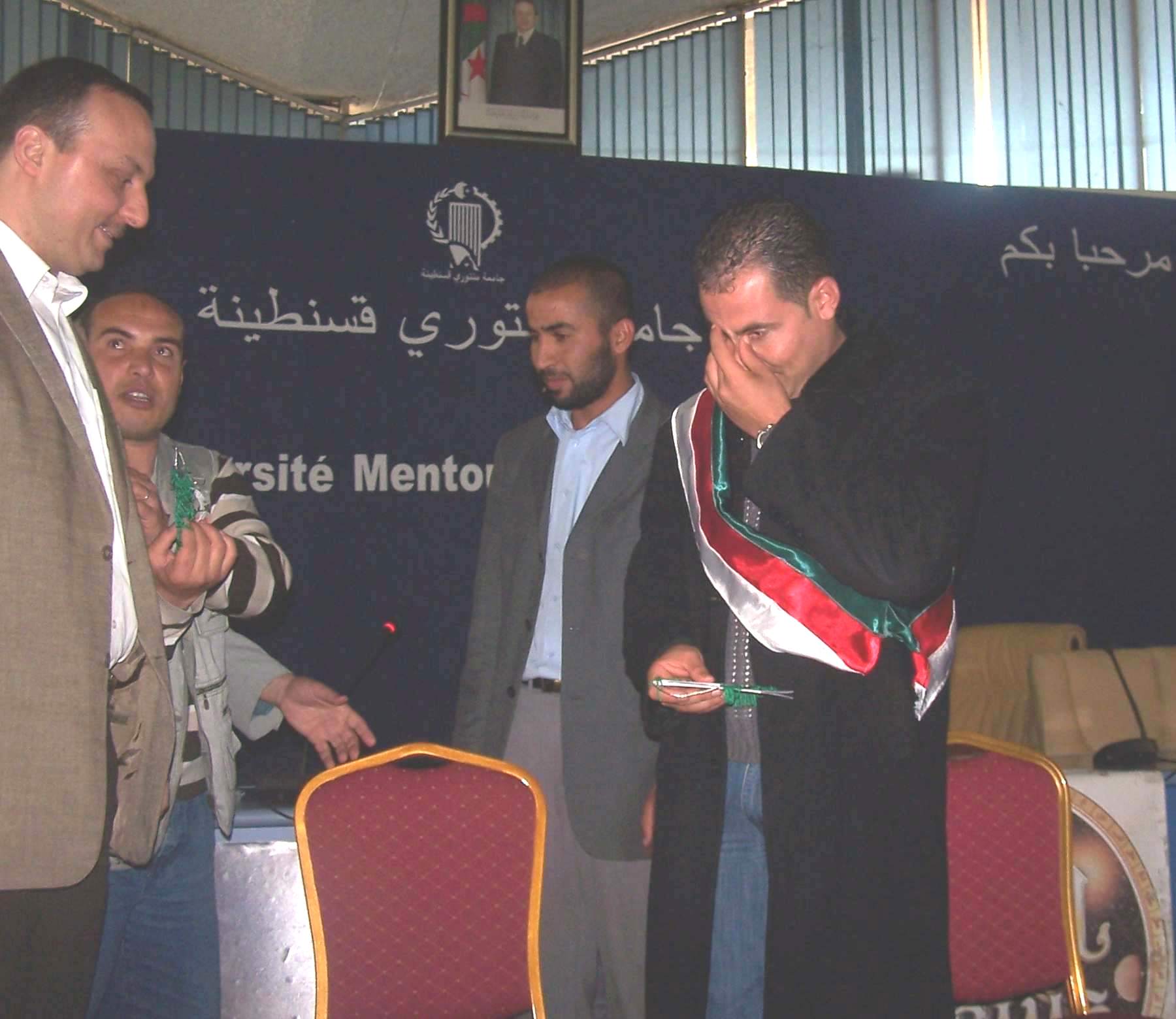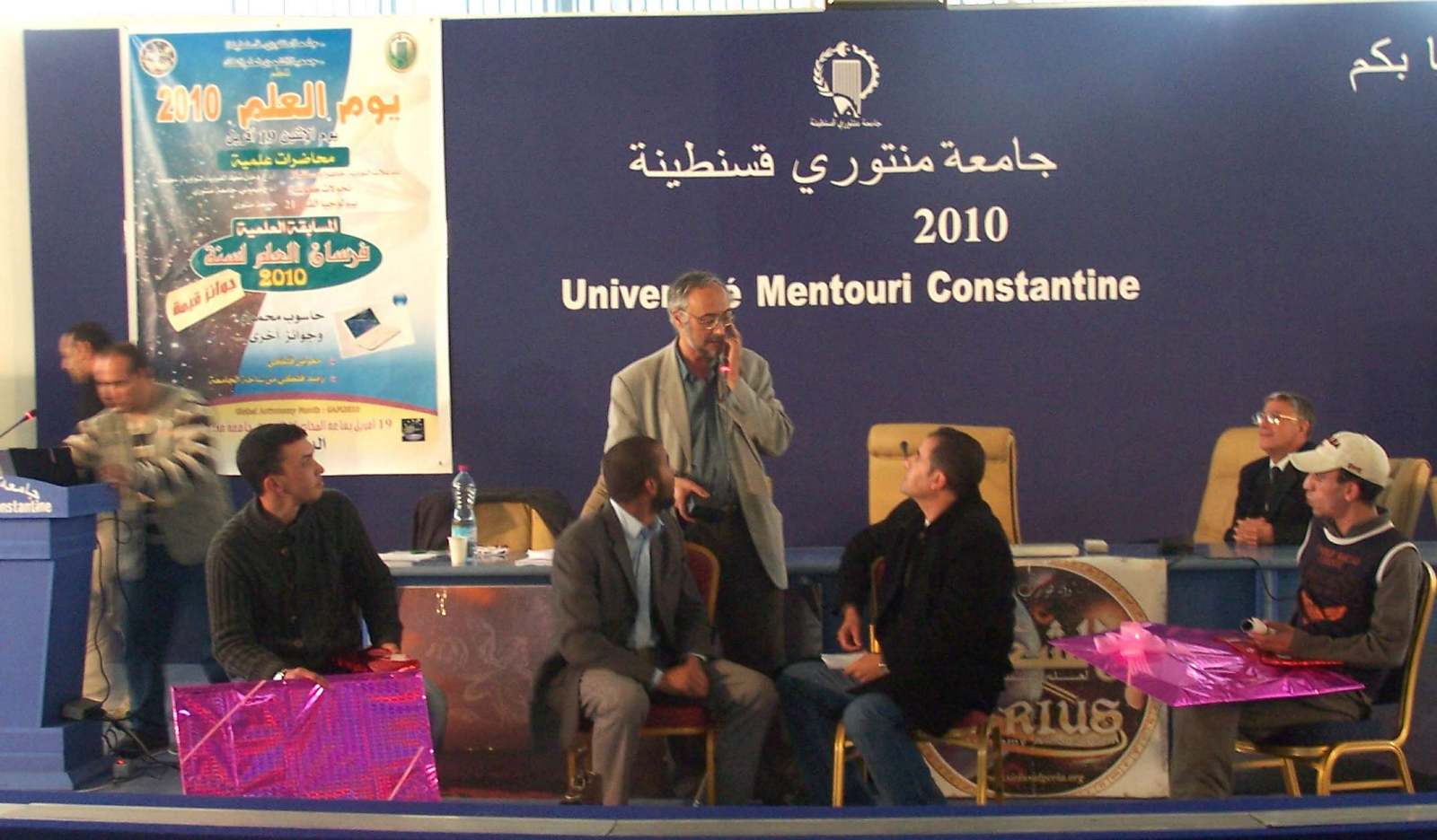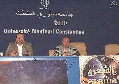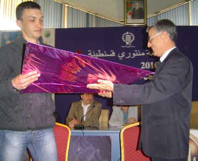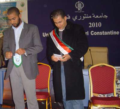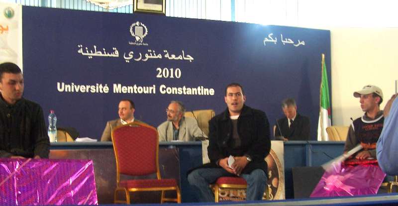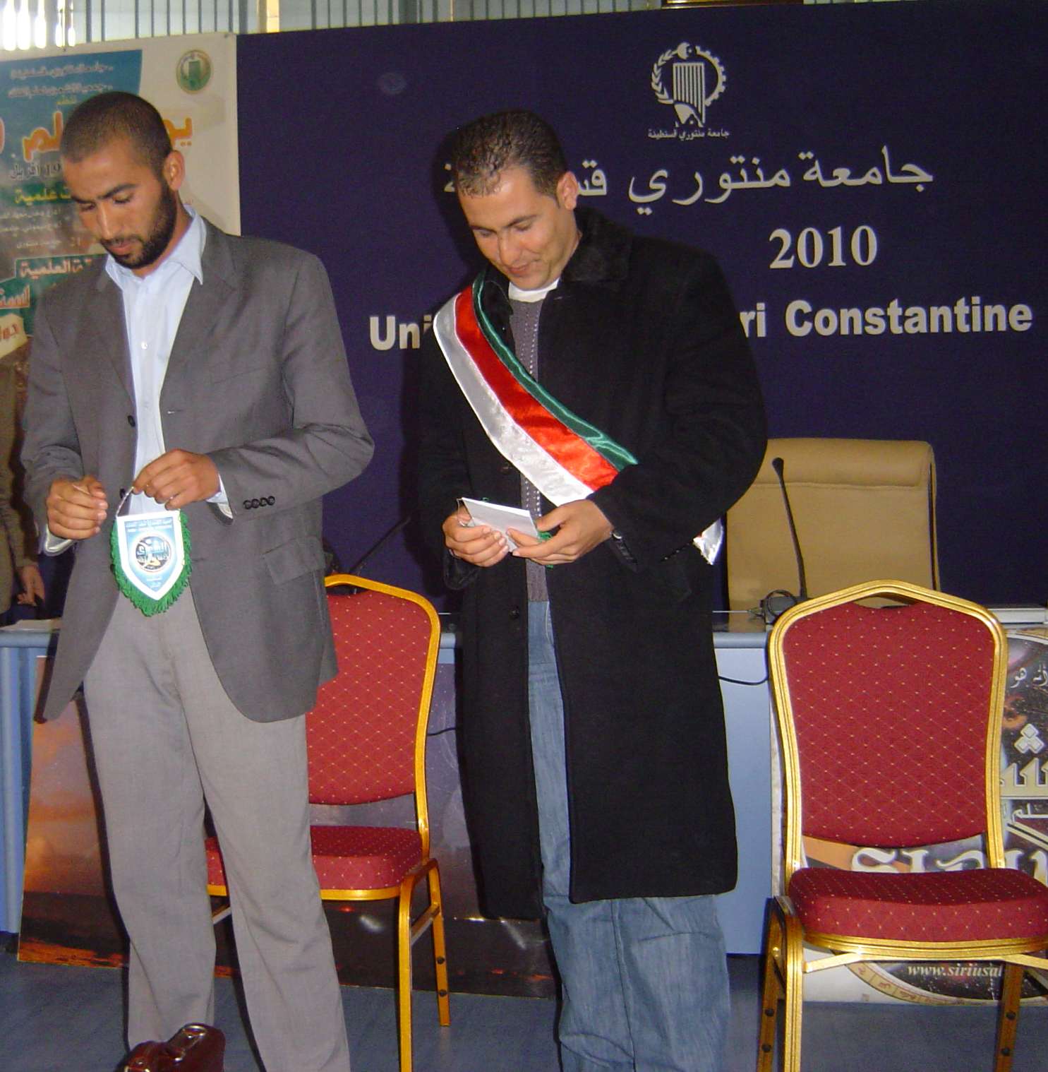 Mezaache Adeel, le Chevalier de la Science 2010 de l’ Université Mentouri (Dept.de Mathématiques). A sa gauche, Hamzaoui Ameur, Sciences Exactes, qui a obtenu le deuxième prix. Tous deux ont eu droit à un laptop.