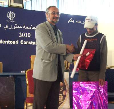 Les 3ième et 4ième prix sont revenues ex æquo à: Benaissa Boubekeur, Sciences de la Terrre. Ici Prof.Afrid du Départ. de Physique lui octroyant le prix.