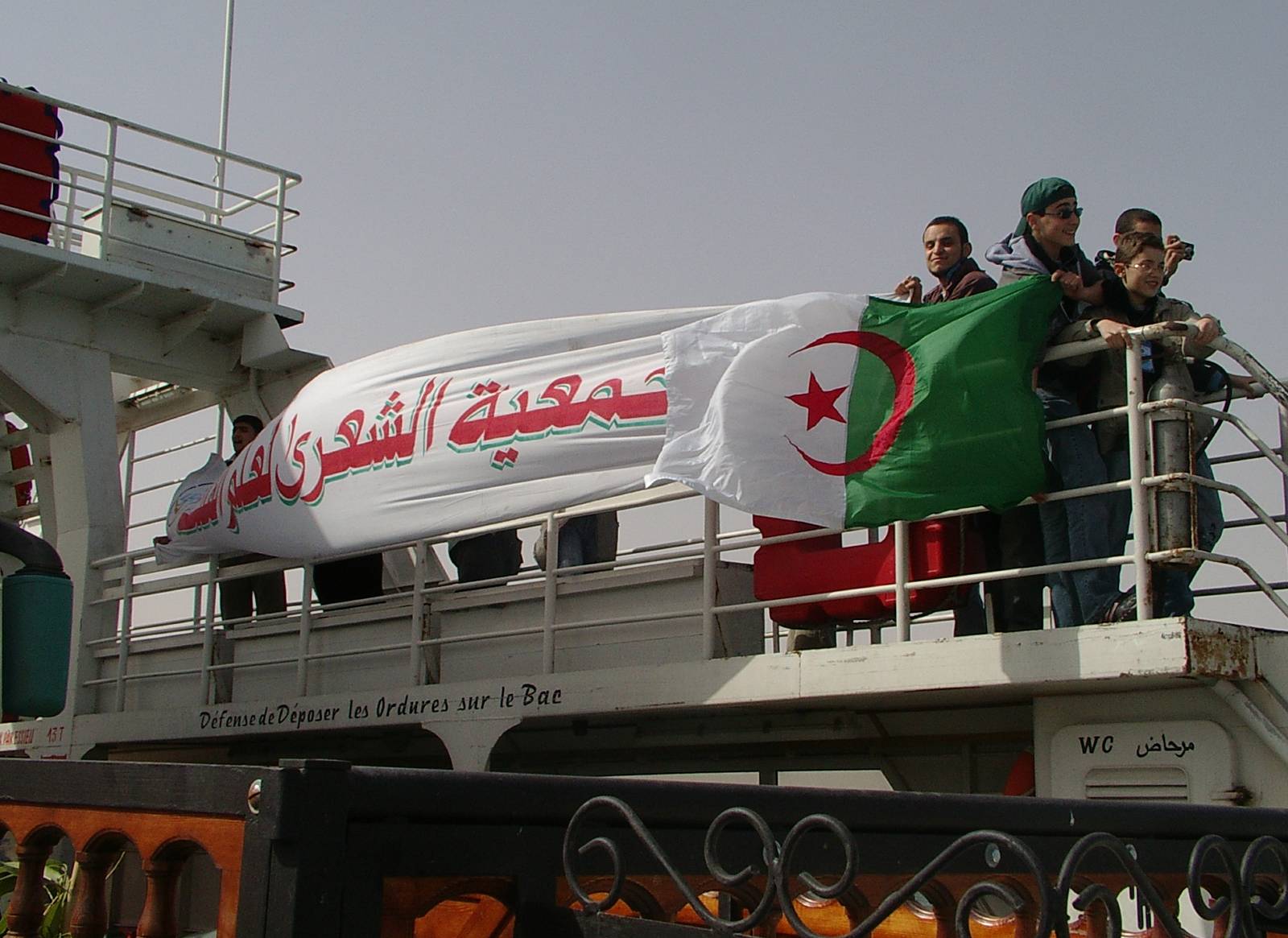 Deploying the Algerian flag in Tunisia. Here the Sirius members aboard the ferry crossing the Djerba straight. |
