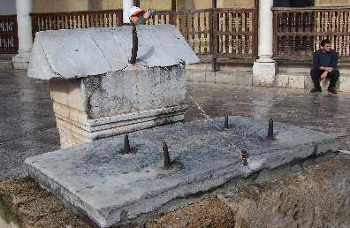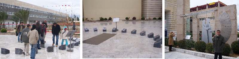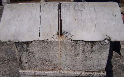 A original analemnatic sundial at the entrance. The gnomon is here the person itself standing in the middle. At right is the clepsydra or water clock used in the antiquity.