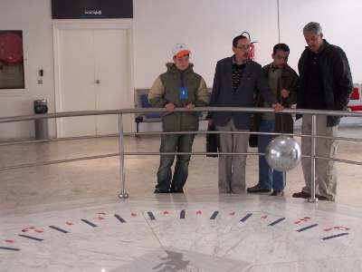 The Foucault pendulum at the main entrance next to the reception desk. Its length is a mere 17m instead of the original one of 67m at the Panthéon in Paris, so it needs to be assisted by electrical impulses so as to compensate for its lack of inertia its quick dampening. It takes it some 40h to swing a full turn.