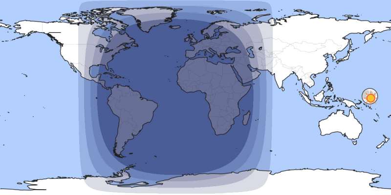 Notice that on March 19th, the moon can be seen in USA. On March 20, it can be easily seen everwhere in the world except New Zealand and parts of Australia