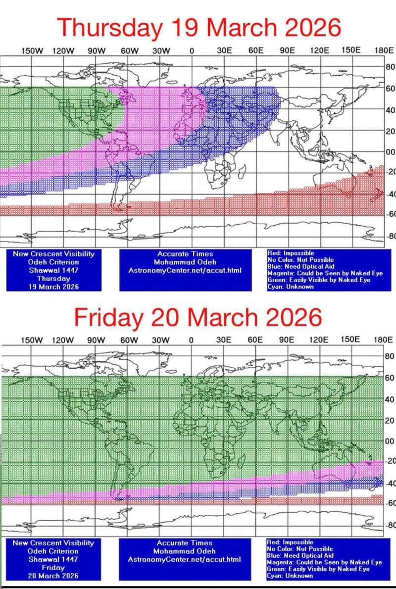 Le cas de la majeure partie de l'Amérique du Nord (et non celle du Sud) est plus simple : la visibilité du croissant y est possible à l'œil nu sans trop de difficulté. Ainsi, on s'attend à ce que le vendredi 20 mars soit le jour de l'Aïd el-Fitr pour les musulmans là-bas.