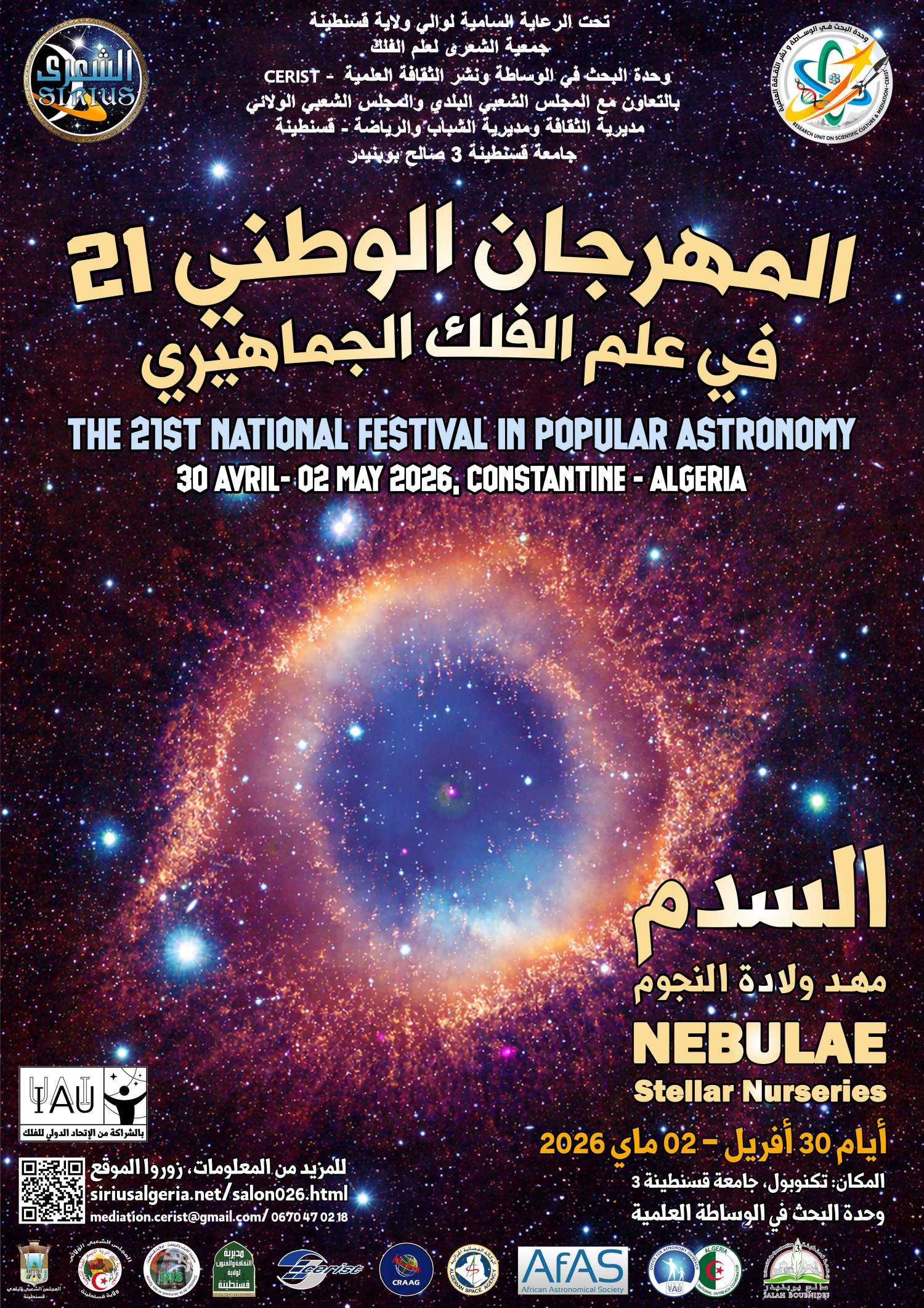 Held in close collaboration with the Scientific Mediation Unit of CERIST, this edition will highlights the vital role these breathtaking celestial clouds play in the birth of stars and the very evolution of galaxies. As usual, the 2026 festival will witness a wide international participation, bringing together prestigious associations and renowned astronomers from Africa, the Middle East, and Europe. The three-day event offers a dazzling array of activities designed to inspire and educate, an immersive Astronomy exhibition, a series of lectures and hands-on workshops led by experts. This in addition to evening sky-watching sessions. The Festival is held under the high patronage of the Wali of Constantine and is organized in collaborative partnership with the APC, the APW, the DJS, and the Direction of Culture of Constantine.